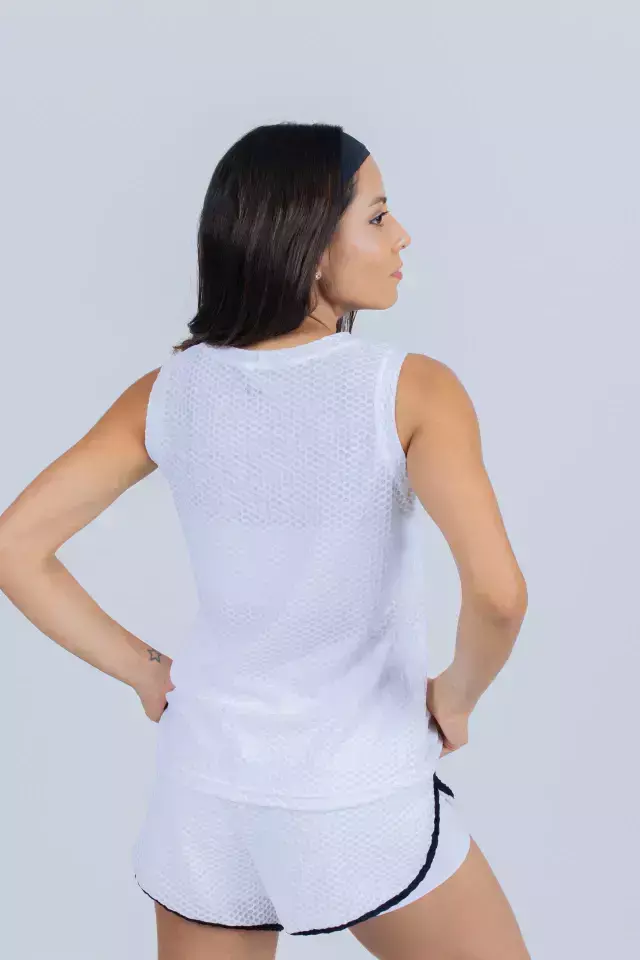 • Regata modelagem reta, em malha de tule com textura e recortes.